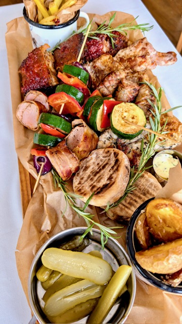 polędwiczka wieprzowa, stek wieprzowy z kością, kurczak Supreme, żeberko w sosie paprykowym, biała kiełbasa, szaszłyki warzywne, opiekane ziemniaki w mundurkach, frytki, proziaki, masło czosnkowe, ogórki kiszone, sosy: czosnkowy, musztardowy, paprykowy