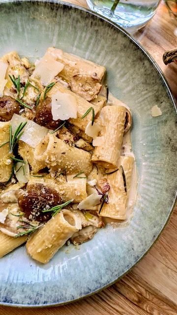 kopytka, kremowy sos z borowikami, czerwona kapusta z rodzynkami