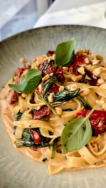 purée ze słodkich ziemniaków i mleczka kokosowego, karmelizowana brukselka z orzechami pekan i żurawiną, zielone sałaty z sosem vinaigrette