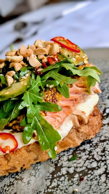 sałata rzymska, ogórki piklowane, czerwona cebula, papryczka jalapeño, prażony sezam, kolendra